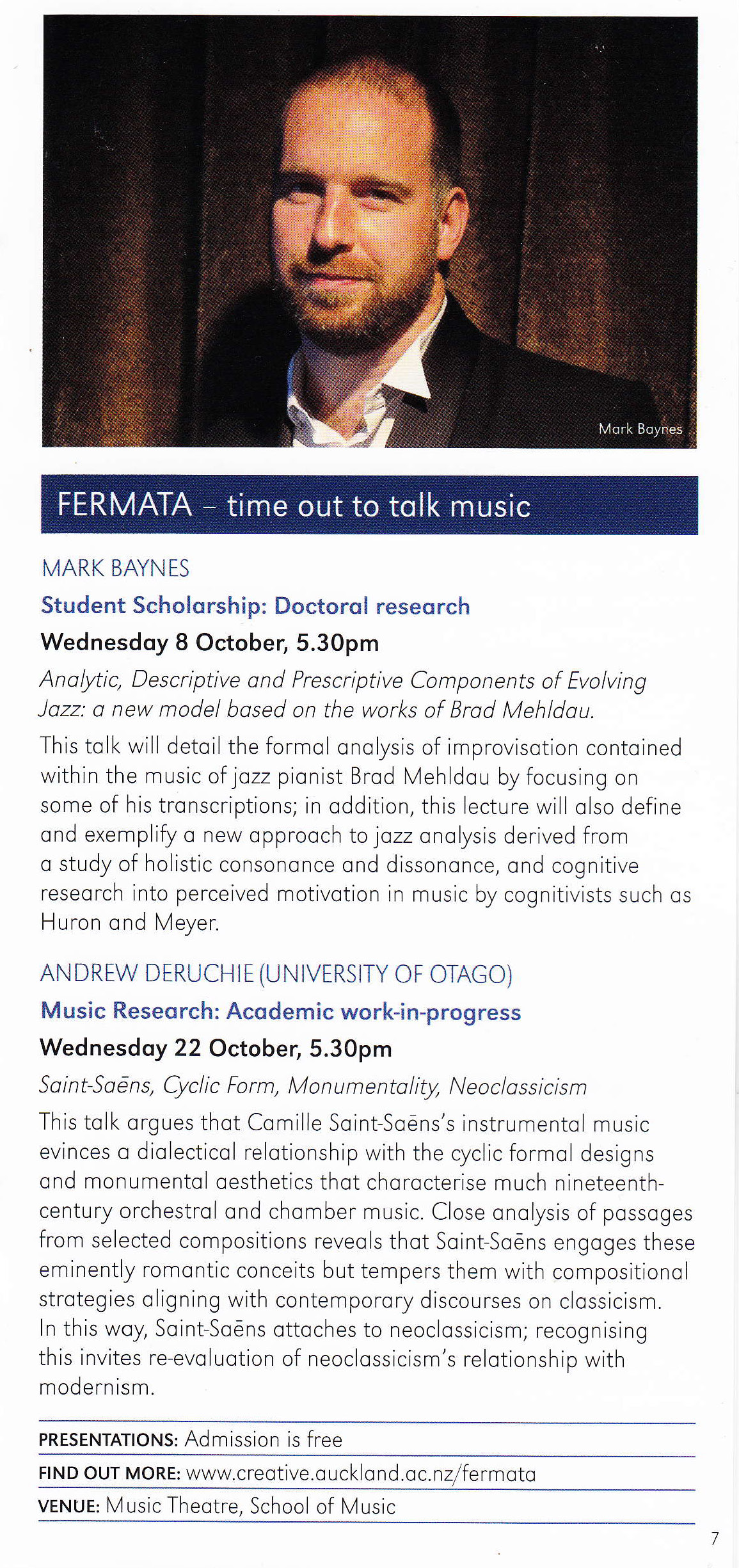 Fermata was founded in 2011 by Senior Lecturers Allan Badley and Davinia Caddy. As a series of public presentations open to all, Fermata exists to promote and extend discussion about music, its role and significance across history, its contemporary cultural currency, and its academic status within the University, the arts and humanities. Presentations take a number of forms – for example, interviews with special guests, round-table discussions, lecture-style talks and question-and-answer sessions – and seek to intertwine the various aspects of musical experience, from listening, performing and composing to thinking critically about questions of musical meaning.